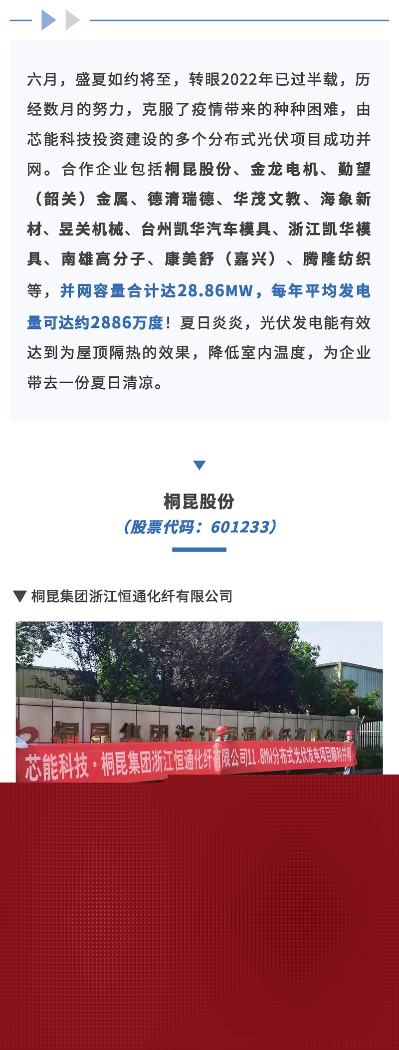 28.86MW!桐昆股份、金龍電機、海象新材等多個分布式光伏項目成功并網 2022-06-20 00:00:00 浙江芯能光伏科技股份有限公司 Viewd 6079 Previous賽峰集團3.82MW分布式光伏項目順利開工 Next芯能科技黨支部開展“追溯紅色記憶,汲取奮進力量”主題黨日活動