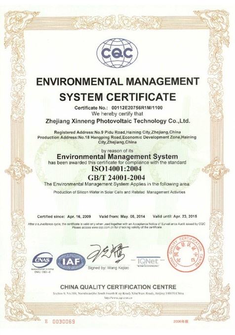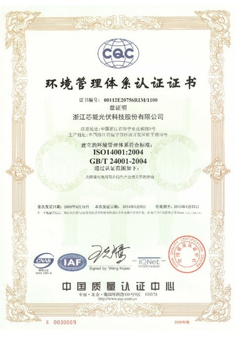 公司通過ISO14001:2004環(huán)境管理體系認證 2009-04-16 00:00:00 浙江芯能光伏科技股份有限公司 瀏覽次數(shù) 7159 上一條公司通過ISO9001:2000質(zhì)量管理體系認證 下一條浙江省科技廳常務副廳長壽劍剛蒞臨我司調(diào)研