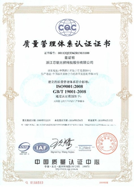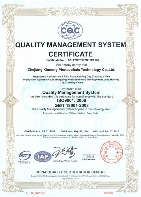 公司通過ISO9001:2000質量管理體系認證 2009-07-02 00:00:00 浙江芯能光伏科技股份有限公司 瀏覽次數 7155 上一條沒有了 下一條公司通過ISO14001:2004環境管理體系認證