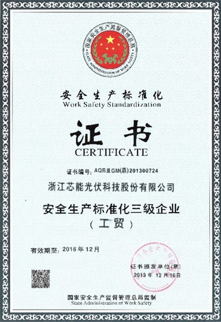 公司通過安全生產(chǎn)標(biāo)準(zhǔn)化三級驗收 2013-12-06 00:00:00 浙江芯能光伏科技股份有限公司 瀏覽次數(shù) 7806 上一條沒有了 下一條“浙江芯能海寧市建材商貿(mào)城1.6MWp光電建筑一體化應(yīng)用示范項目”成功驗收